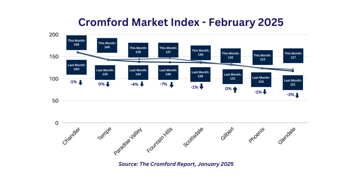 Think of the Cromford® Market Index (CMI) as a scoreboard for real estate. If a city’s score is above 100, sellers have the advantage—meaning homes are in high demand and prices tend to favor them. If the score drops below 100, buyers gain the upper hand with more negotiating power and lower competition. So, how are Arizona’s top markets performing right now?