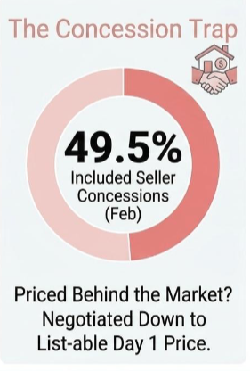 One of the most telling trends is seller concessions. Nearly half (49.5%) of February closings included some form of concession, from covered closing costs to home warranties or prepaid HOA dues. For buyers, concessions ease upfront costs. For sellers, they reflect the reality that while home prices remain high compared to 2020, buyers are balancing additional costs like furnishing, inspections, and down payments. Concessions have become an essential tool to bridge that gap.