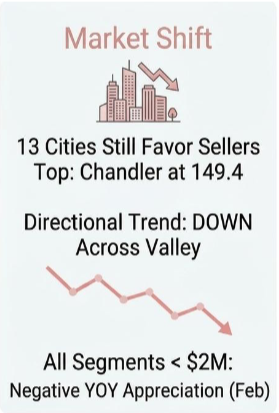 Across the Valley, 13 cities remain technically in a seller’s market, with Chandler continuing to hold strong. But that doesn’t mean buyers don’t have opportunities. Today’s market is highly situational: success depends on the property, the timing, and the strategy. As of March 26, 2026, there were 26,501 active listings, giving buyers options if they know where to look.