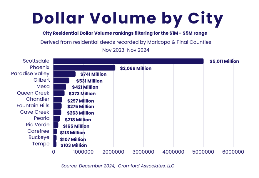 Let’s take a closer look at the $1 million to $5 million price range. Scottsdale takes a commanding lead with $5,011 million in sales, more than double the $2,066 million recorded by Phoenix. This highlights Scottsdale’s appeal to buyers looking for upscale homes.