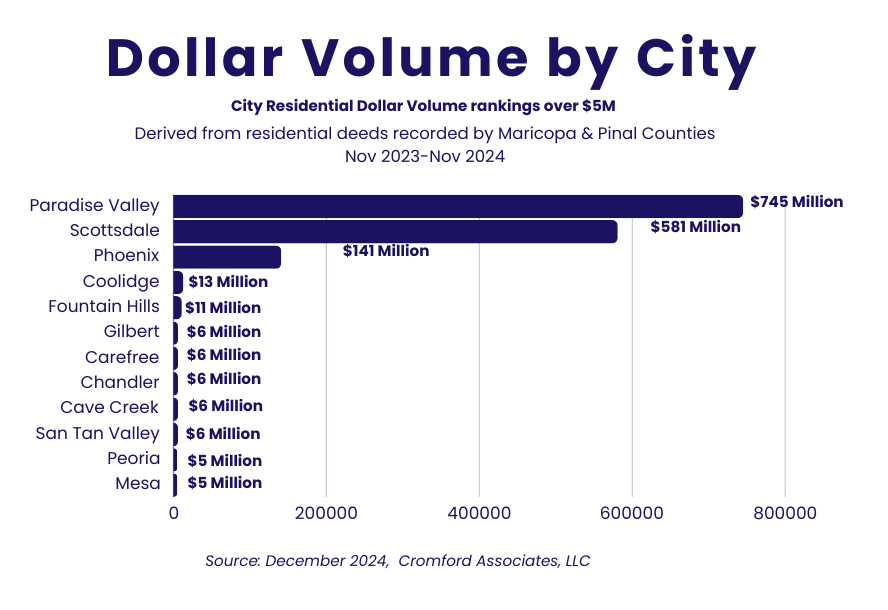 With 2025 just around the corner, it’s the perfect time to explore a question that often arises in Arizona’s real estate circles: “Where’s the money flowing?” Recent data from Cromford Public, an add-on to the widely respected Cromford Report, reveals fascinating insights about the residential real estate dollar volumes across Maricopa and Pinal Counties from November 2023 to November 2024. Let’s break it down in a way that’s easy to understand and dive deeper into the trends of the current market.